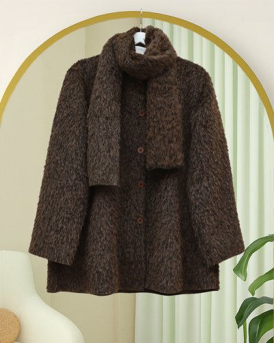 • Atkı Detaylı Önü Düğmeli Sakallı Ceket Kahve