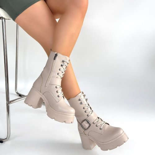 • Linma Bej Cilt Bağcıklı Topuklu Bot