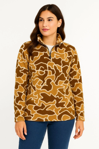 • KADIN Yarım Fermuarlı Desenli Polar Sweat Yakalı Uzun Kollu Oversize Rahat Kalıp Kahverengi